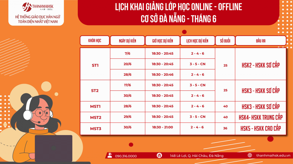 Lịch khai giảng các lớp tiếng Trung cơ sở Đà Nẵng tại THANHMAIHSK tháng 6/2021 Địa chỉ Cơ sở: Số 148 Lê Lợi – Quận Hải Châu – Đà Nẵng Hotline: 090.316.0000 (8h30 đến 21h các ngày trong tuần) Lịch khai giảng lớp học Tiếng Trung cơ sở Đà Nẵng 1. Lớp học tiếng Trung ST1 Đối…