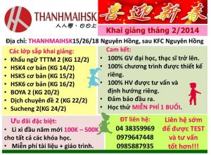 1. HSK4 cơ bản ( 30 buổi/ khóa ) : 14/2 2. HSK5 cơ bản (...
