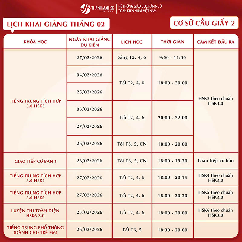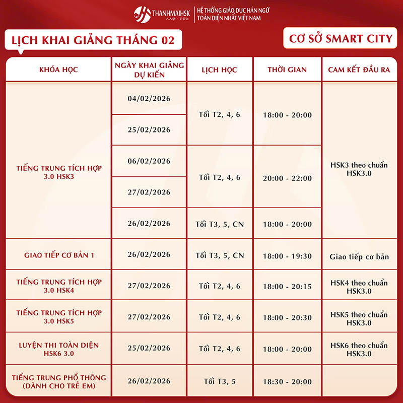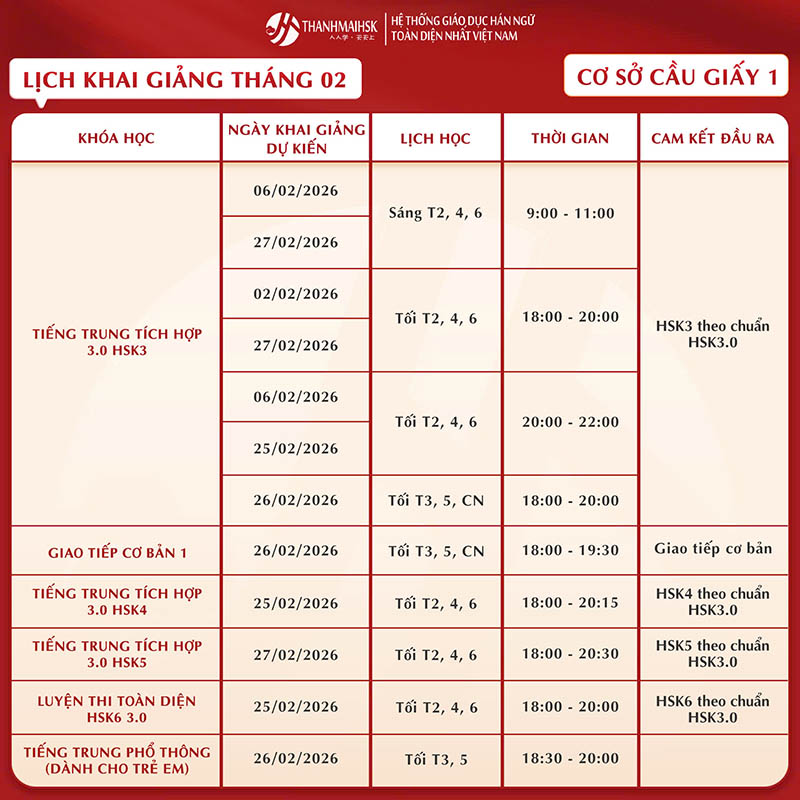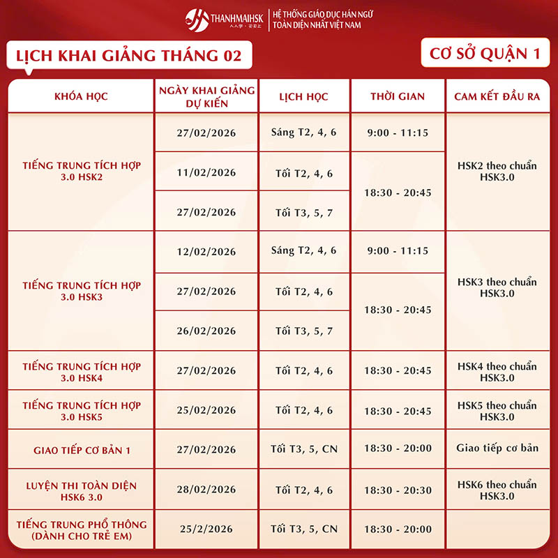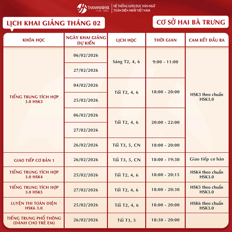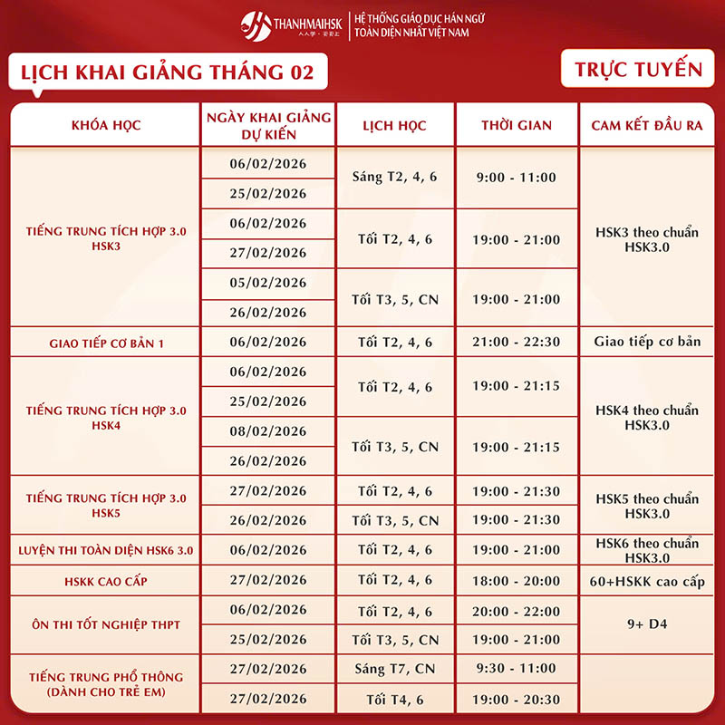 Lịch học tiếng Trung tháng 2/2026 của THANHMAIHSK