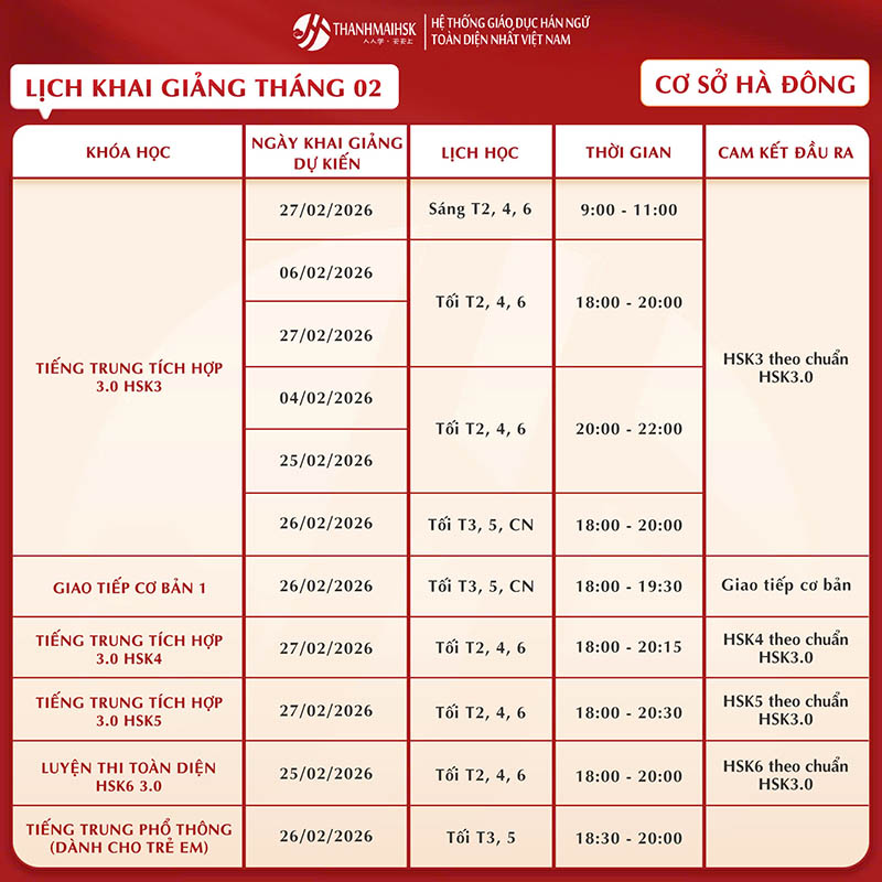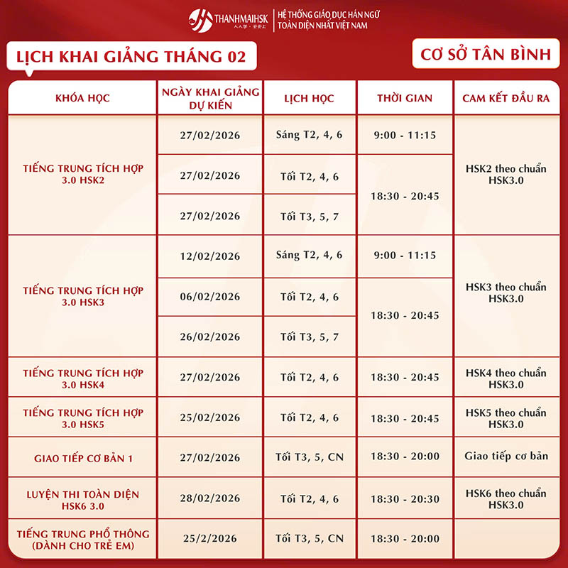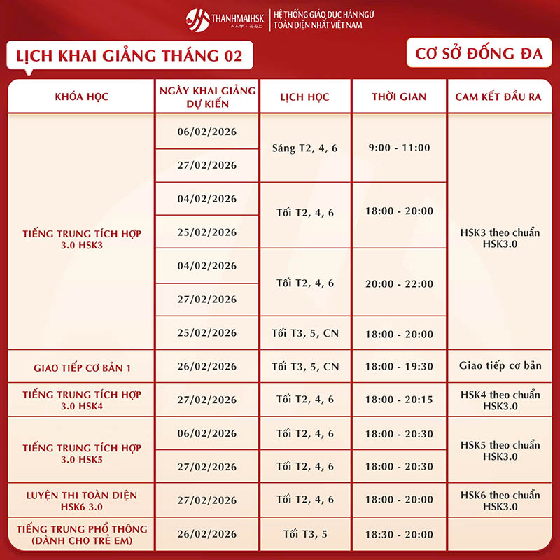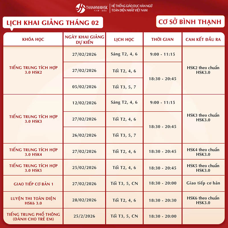 Lịch học tiếng Trung tháng 2/2026 của THANHMAIHSK