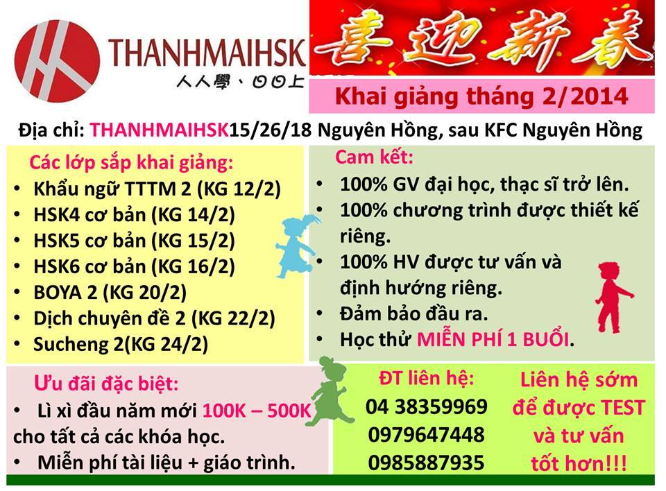 1. HSK4 cơ bản ( 30 buổi/ khóa ) : 14/2 2. HSK5 cơ bản ( 30 buổi/ khóa ) : 15/2 3. HSK6 cơ bản ( 30 buổi/ khóa ) : 16/2 4. BOYA2 ( 36 buổi / khóa ) : 20/2 5. Dịch chuyên đề 2 ( 15 buổi / khóa ): 22/2 6. Su…