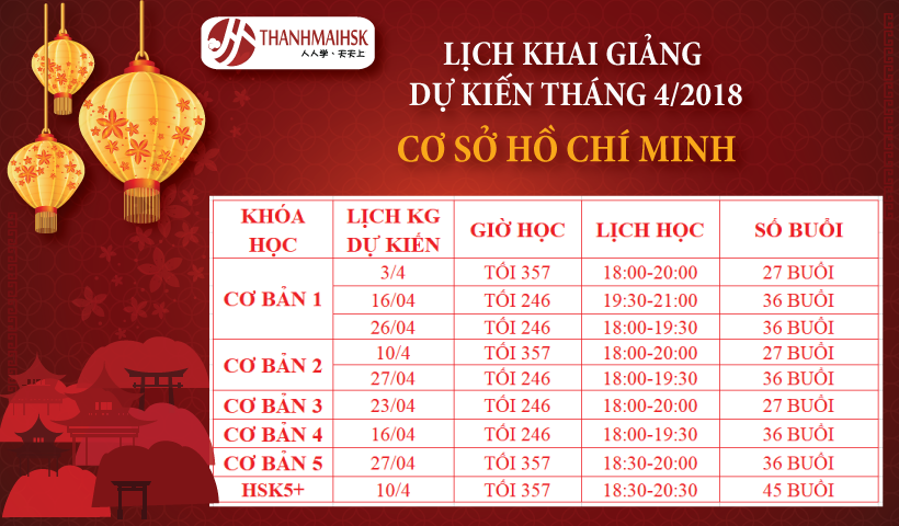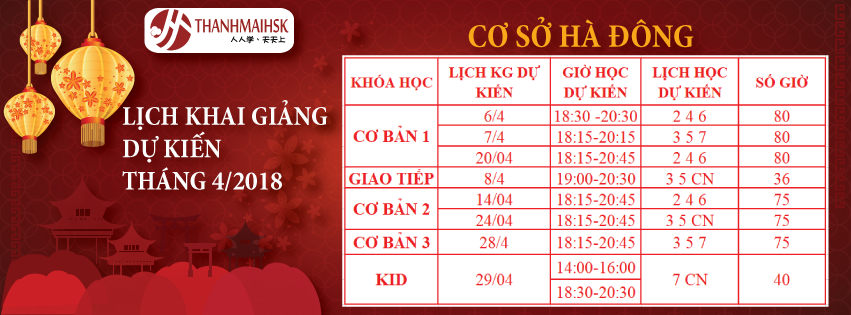 Lịch khai giảng dự kiến tháng 04/2018 các khóa học tiếng Trung tại THANHMAIHSK cơ sở 3 – Hà Đông đã có. Check ngay các lớp mà bạn cần để đăng ký học sớm nhé! KHOÁ HỌC CƠ BẢN 4 KỸ NĂNG (Nghe-Nói-Đọc-Viết) Đối tượng: Các bạn yêu thích học tiếng Trung, muốn có nền…