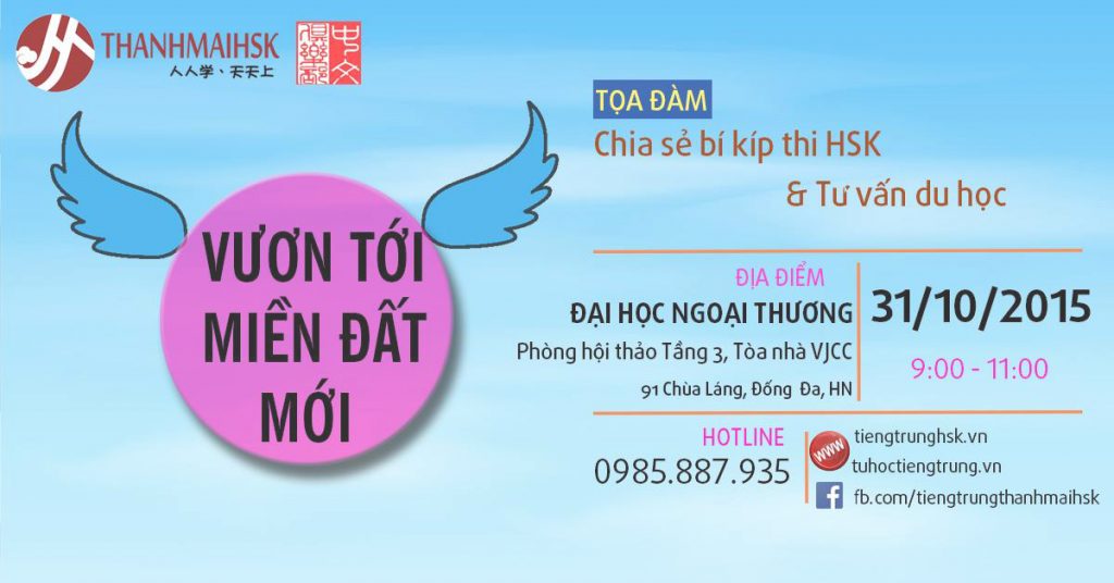 Chào các bạn, Chỉ với 120 phút rất đáng giá tại buổi tọa đàm mang tên “Chia sẻ bí kíp thi HSK & Tư vấn du học” sẽ cho bạn cái nhìn tổng quát nhất về đất nước và du học Trung Quốc cùng nhiều phần quà ưu đãi hấp dẫn đang chờ đón bạn…